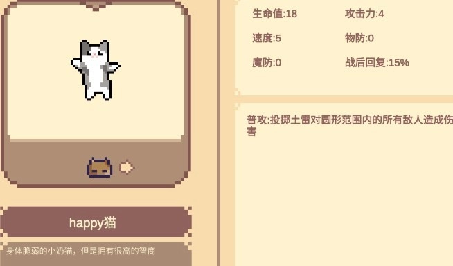 hy猫:普通攻击时会投掷土雷,对圆形范围内的所有敌人造成伤害。达到2星后,它会投掷炸药,对圆形范围内的所有敌人造成伤害。当提升至3星时,hy猫会投掷高爆炸药,对圆形范围内的所有敌人造成巨量伤害。