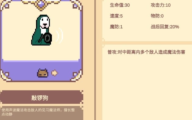 敲锣狗的普攻能对中距离内的多个敌人造成魔法伤害。升到2星后,它的普攻会攻击附近中距离圆形范围内的所有敌人。当达到3星时,技能1会变为持续敲锣状态,对周围敌人造成连续伤害并附带击退效果。