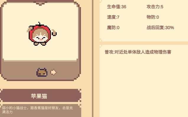 苹果猫的普攻能够对近距离的单个敌人造成物理伤害。当它达到3星时,技能1会获得霸体效果;技能2则可以对自身周围3米范围内的敌人施加无视防御的中毒伤害。