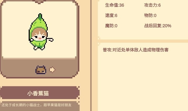 小香蕉猫:普通攻击能对近距离范围内的单个敌人造成物理伤害。当达到3星时,技能1将获得霸体效果;技能2会对附近的单个敌人造成物理伤害,同时使其陷入3秒的眩晕状态。