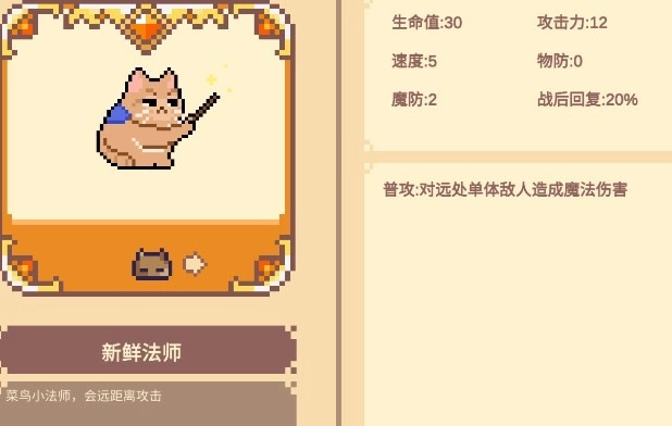 新鲜法师:普通攻击能对远处单个敌人造成魔法伤害。2星时,普攻会对远处多个敌人造成魔法伤害。3星状态下,普攻不仅会对远处大范围里的多个敌人造成魔法伤害,还会附加减速效果;技能1瞬移的效果是,当自身受到近战敌人攻击时,会随机传送到一名友方角色的附近;技能2则能对全屏范围内的所有敌人造成魔法伤害。