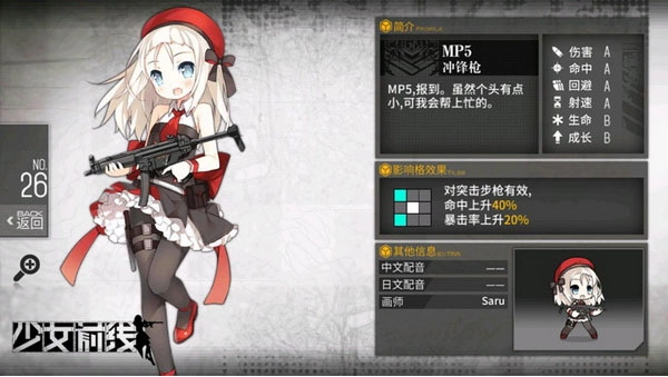 2、作为前排肉盾,生命属性虽不算突出,但凭借高回避的优势弥补了这一短板,让她的生存能力得到明显提升。她射速极快且伤害可观,能迅速清除敌人的有效战力,在应对密集的敌方近战单位(比如机械兵)时表现尤为出色。