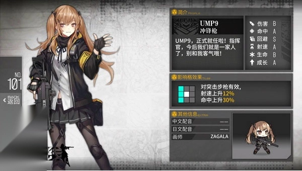 2、闪避属性达到S级,是UMP9能成为出色肉盾的核心原因,再配合成长评级A,后期的闪避能力会愈发强劲。UMP9的技能是范围控制类的“闪光弹”,既能为梯队争取作战时间,也进一步减少了自身遭受重创的可能。