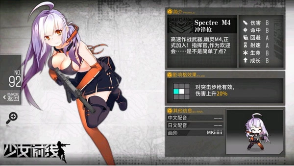 2、没有C项,属于能力均衡的低星枪娘,主要突出的属性恰好是前排适配的回避能力。SpectreM4的技能是掩护专注,在持续时间内能够提升自身闪避,适合作为前期对抗BOSS时的前排角色。