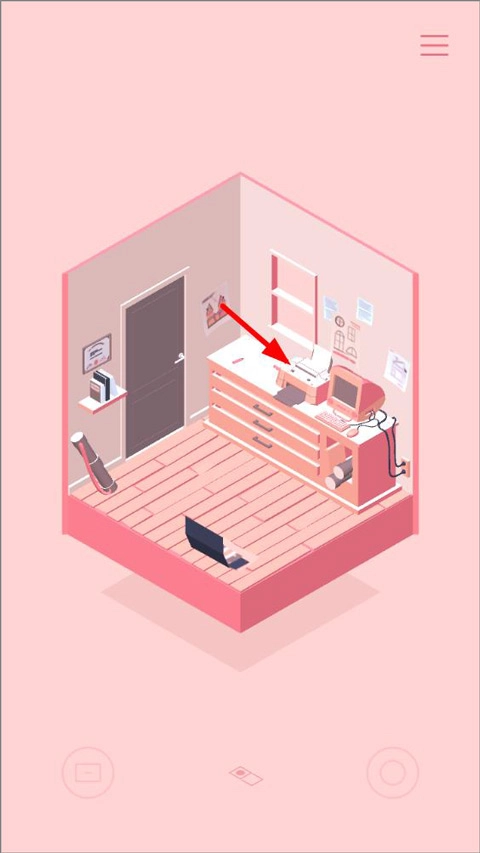 走下楼梯,前往下图所示的房间,点击柜子上的打印机,按下打印机上闪烁的按钮,然后点击打印出的文件以获取它,留意文件左上角的图案。