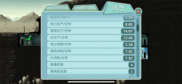 查看避难所的电力/水/食物,生产等消耗信息。