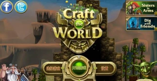 1、这是成功进入游戏后的界面。左上角的两个按钮用于分享到Facebook和Twitter,实用性不高。右上角带有对勾标记的“Sister in Arms”和“Dig with Friends”,前者意味着你的队伍中会出现女矮人角色,后者则代表多人游戏功能已开启。
