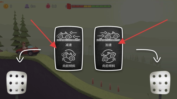 驾驶红色赛车时,需依据地形切换加速或减速,并通过倾斜车身来保持平衡,以应对爬坡与下坡的情况。其中,左踏板对应“减速、向前倾斜”的操作,右踏板则对应“加速、向后倾斜”的操作。