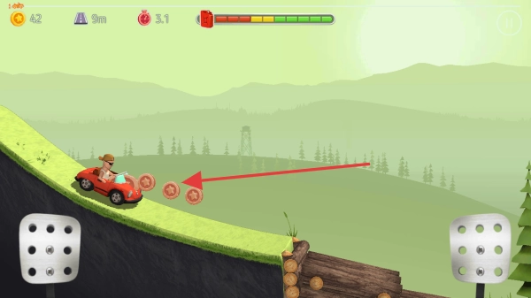 在爬坡的时候,要留意路上的金币(像山坡上的圆形硬币),调节好车速和车身的角度,保证能顺利捡到它们。攒下来的金币可以用来给车辆升级,还能解锁新的赛道。