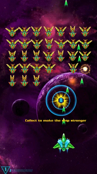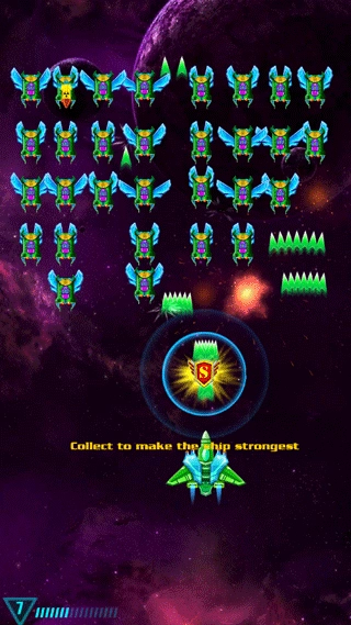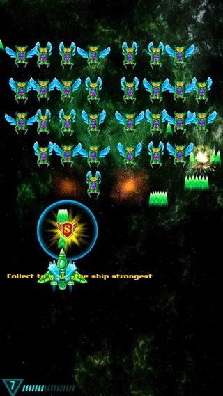 2、总共有三波敌人,第一波难度最低,玩家在击毁敌人飞船后还能拾取强化道具