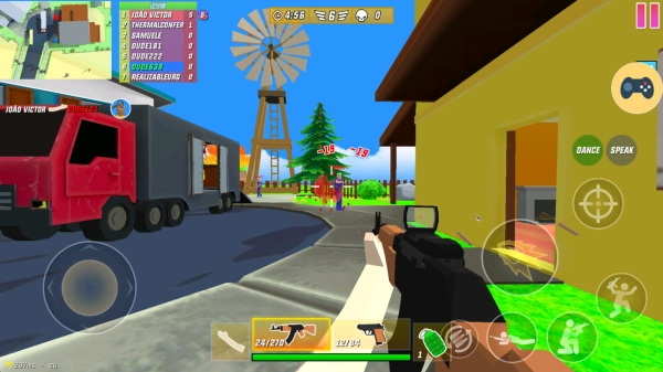 2、通过左侧轮盘控制角色移动,右侧控制跳跃蹲伏趴下,以及瞄准射击。