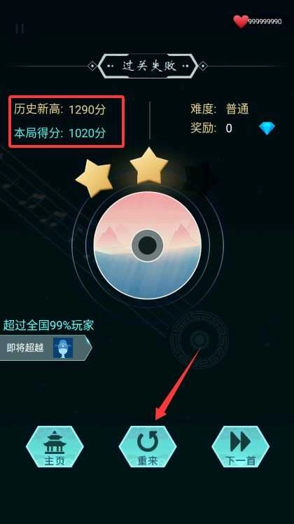 每首曲子结束后,你可以查看详细的得分数据,然后选择重新挑战当前曲目,或者解锁下一首曲子继续进行游戏。