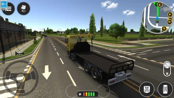 1、借助左侧的虚拟方向盘来操控转向,右侧的踏板各自负责控制加速和制动,按下R键可切换至倒车模式。