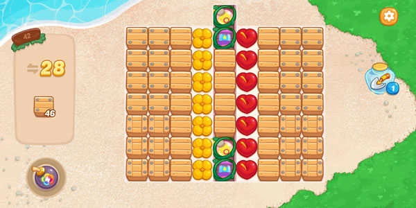 在消除界面的左侧,会显示当前关卡的剩余步数以及通关所需达成的目标。就拿图中的情况来说,当前关卡还剩下28步可以操作,并且需要消除46个箱子才能够完成这一关卡的挑战。