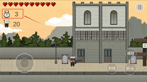 2、游戏开始后观察上方红心生命值,使用右侧"跳跃"按钮躲避障碍,同时收集金币增加"20"的金钱数值。