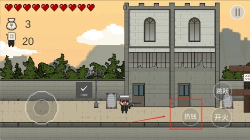 3、遇到敌人时点击红色框选中的"扔钱"按钮释放技能,或使用"开火"进行攻击,注意合理分配道具数量"3"。