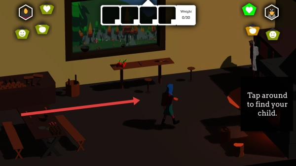 2、进入酒馆场景后,按照箭头的提示,点击屏幕进行探索,找到“child”,以此触发剧情,推动“find-your-child”任务的进展。