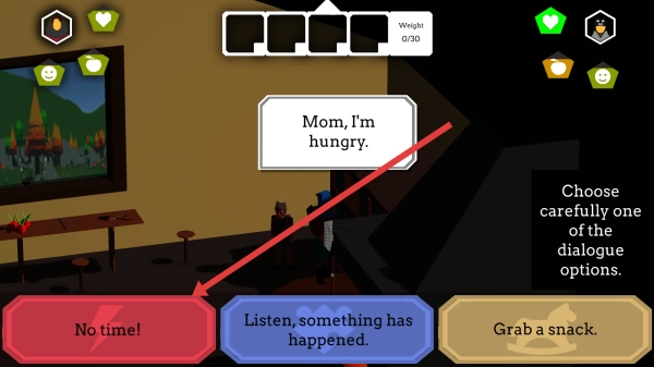 3、当出现对话选项时,按照箭头指示选择“NO-TIME!”,以此回应孩子的“Mom,I’m-hungry.”,这会对剧情发展产生影响,之后便可继续推进冒险进程。