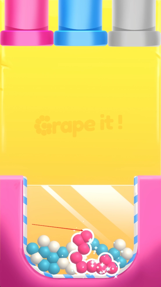3、在规定时间内精准完成所有颜色葡萄球的分类就能通关,通关后可以解锁新的吸附道具以及更复杂的彩色小球组合关卡。