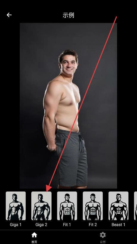 1、首先选择初始模板!点击底部的“Giga1/Fit1”等体型选项,3秒就能应用到示例图上,不用纠结,每切换一次模板,就能直观看到身材差异,操作超顺畅,轻松锁定目标塑形方向。