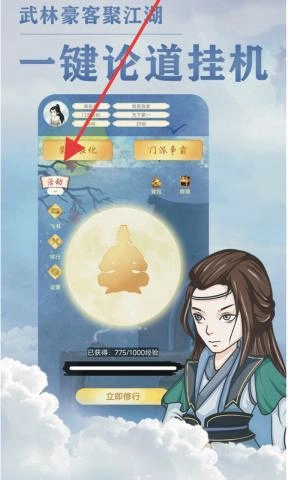 3、试试“挂机论道”功能!点击“一键论道挂机”,就能在江湖中自动积累资源,一整晚都能持续获取收益。每挂机8小时,还能得到100点修为,用来解锁“隐藏绝学”的修炼——这可是超重要的哦!