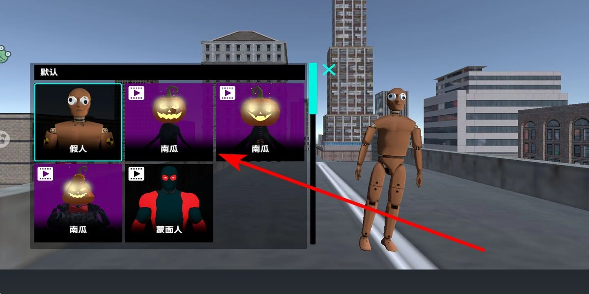 1、启动游戏后,在界面里找到皮肤相关的选项并点击,进入皮肤选择界面。在这里可以挑选假人、南瓜、蒙面人等多种风格的皮肤,给角色换上自己喜欢的装扮。
