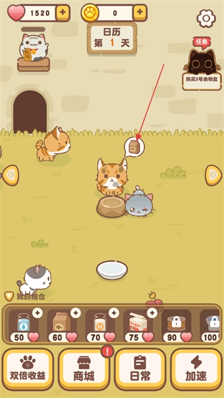 1、点击小流浪猫上方的喂食图标按钮,为小流浪猫倒粮喂食。