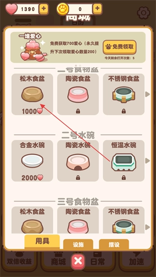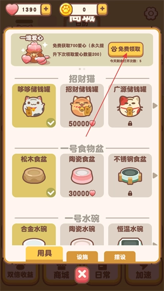 3、点击下方的商城,每日都能免费领取五次大量爱心,助力玩家更好地照顾小猫。