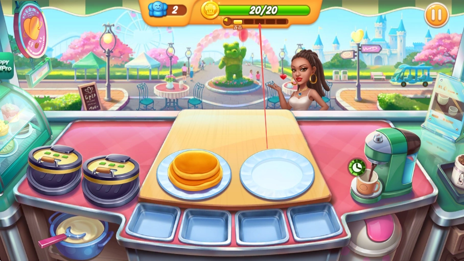 4、当顾客点单饮品后,需操作咖啡机等设备制作对应饮品,然后快速将饮品送上以获取金币,进而完成关卡通关。