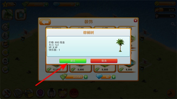 2、进入装饰界面后,挑选棕榈树之类的装饰性建筑,点击建造按钮,就能为城市增添装饰元素,进而提升城市的美观程度与居民的快乐值。