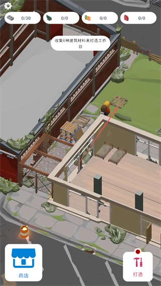 2、按照提示要求,收集6种建筑材料用于制作工作台,可通过采集车辆、建筑废墟等不同区域的资源来获取所需材料。