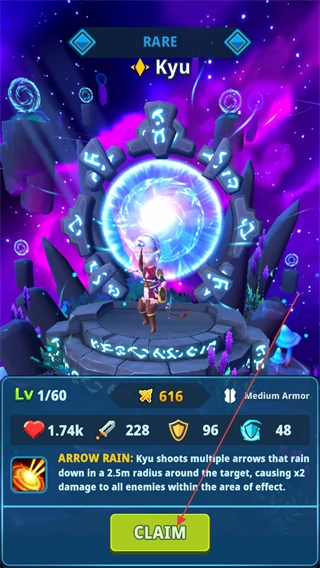 3、召唤获得RARE品质的英雄Kyu,其拥有技能ARROWRAIN,点击界面的CLAIM按钮即可领取该英雄。