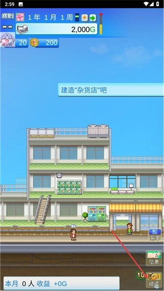 进入商场主界面后,按照提示需要建造杂货店,点击界面右下角的建造按钮,就能进入店铺建造的选择界面。