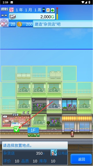 4、进入放置界面后,按照“请选择放置地点”的提示,选定1F的空位,点击绿色对勾,就能完成杂货店的放置建造。