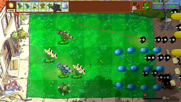 2、种植西瓜投手等攻击植物,构建防御阵线,拦截僵尸,减少其推进速度。