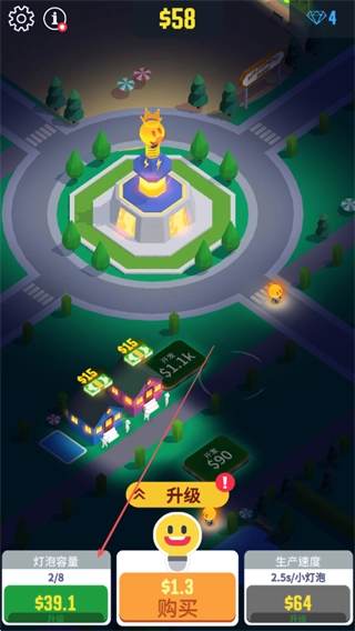 升级之后,灯泡的容量与生产效率都得到了提升,这样一来就能收集到更多的灯泡和金币了。