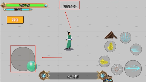 2、操作界面设计简洁明了,屏幕下方设有修炼与战斗的功能按钮,上方区域则清晰展示角色当前的属性数值与境界等级,便于玩家随时根据这些信息调整策略。