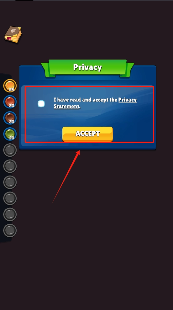 1、点击屏幕下方的黄色ACCEPT按钮以接受隐私协议,左上角的书本图标或许是帮助文档,带有数字的圆圈则表示资源数量。