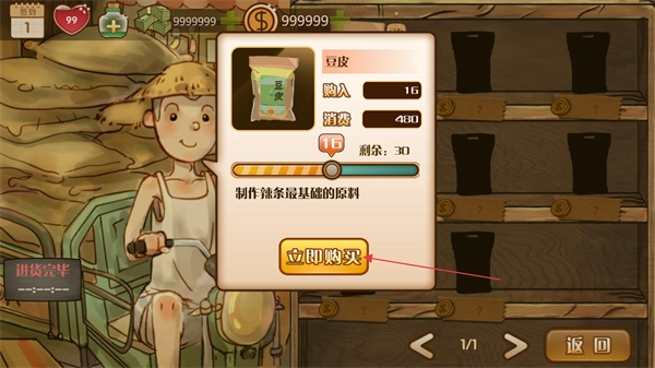 在进货界面挑选豆皮这类食材,点击立即购买按钮,消耗金币来补充库存,比如把豆皮的库存从30往上提升。