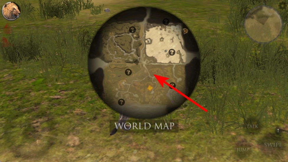 进入游戏后,按照红色箭头的提示,点击世界地图上的目标区域,确定接下来探索的位置方向。