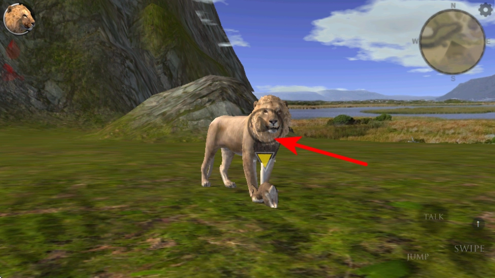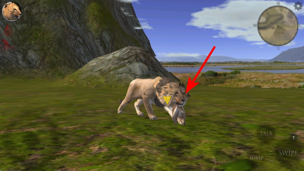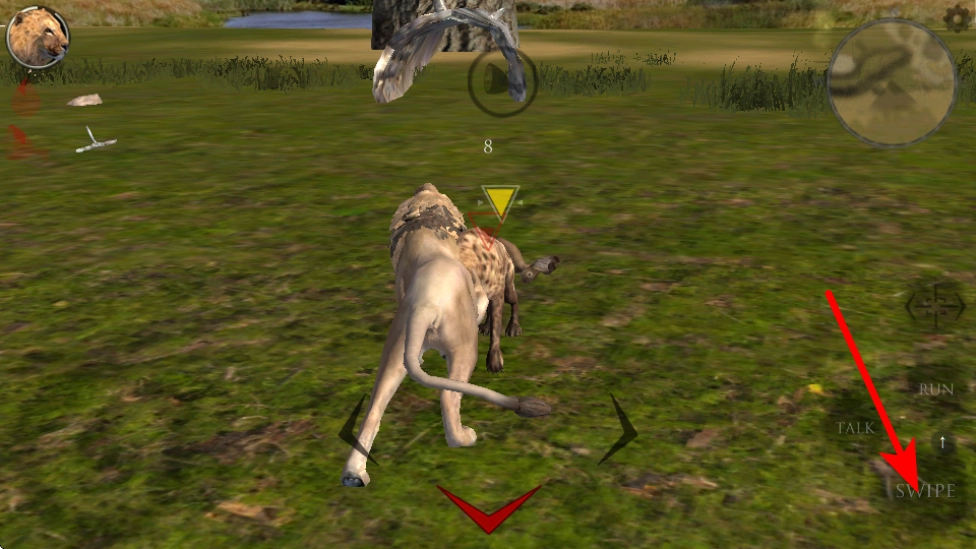 当遇到鬣狗这类新的目标动物时,按照红色箭头所指的方向,点击SWIPE按钮就能触发攻击动作,进而完成狩猎任务。