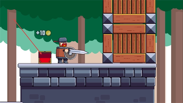 战斗结束后,操控角色移动到红色宝箱附近,领取10金币的奖励,接着前往木门的位置,继续推进游戏进程。