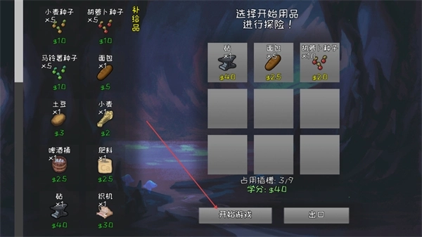 在准备界面挑选种子、面包等物资添加到右侧栏,然后点击开始游戏,就能进入殖民地了。