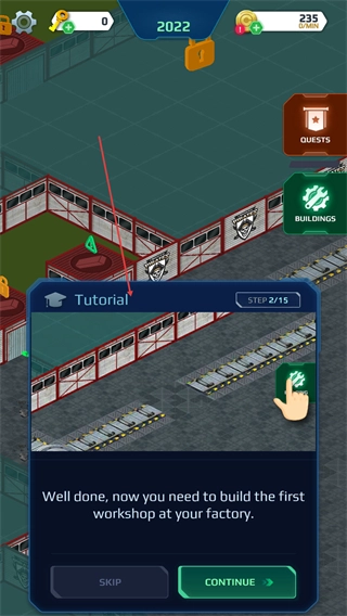 按照教程提示操作,点击CONTINUE按钮推进教程流程,为建造车间做准备。
