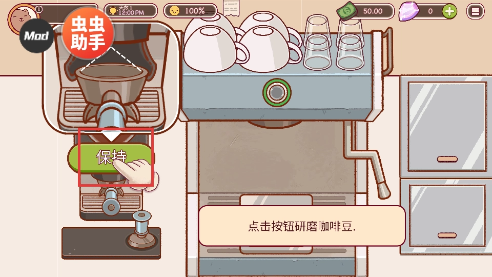 点击【保持】按钮,研磨咖啡豆,制作咖啡原料。