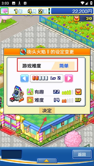 进入【街头火焰Ⅱ】的设定调整界面,把游戏难度设置为【简单】,点击【确认】,以此提升街机的趣味性等相关属性。