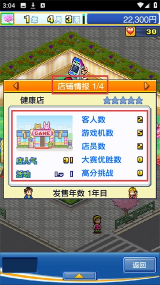 可以查看【店铺情报】,留意客人数【2】、游戏机数【5】这类数据,后续可以通过提升店铺人气等办法,来增加客人数和大赛优胜数。