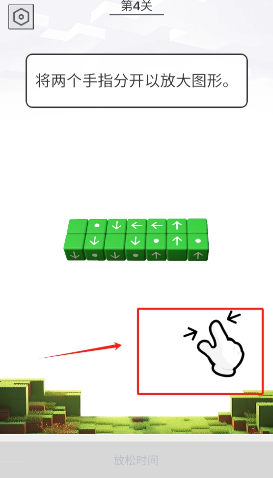 3、用两根手指分开操作来放大绿色方块组,按照提示调整视角,下方有草地图案可供参考。