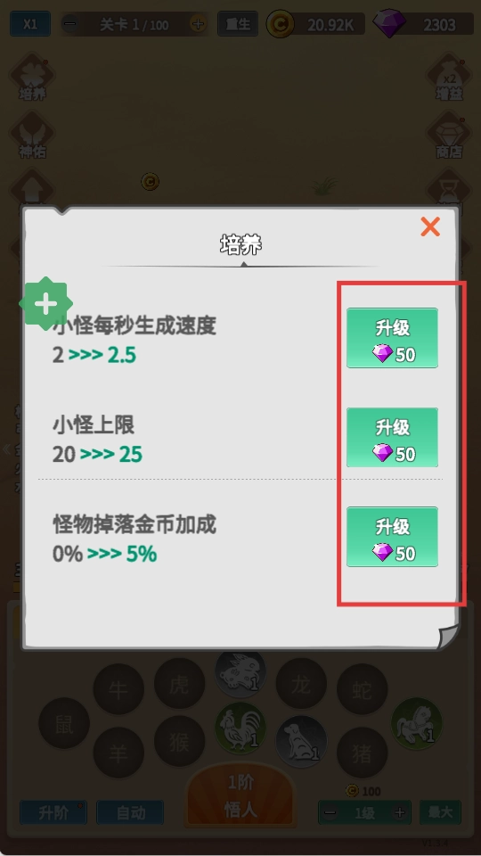 升级培养属性,优化游戏资源获取和战斗环境。