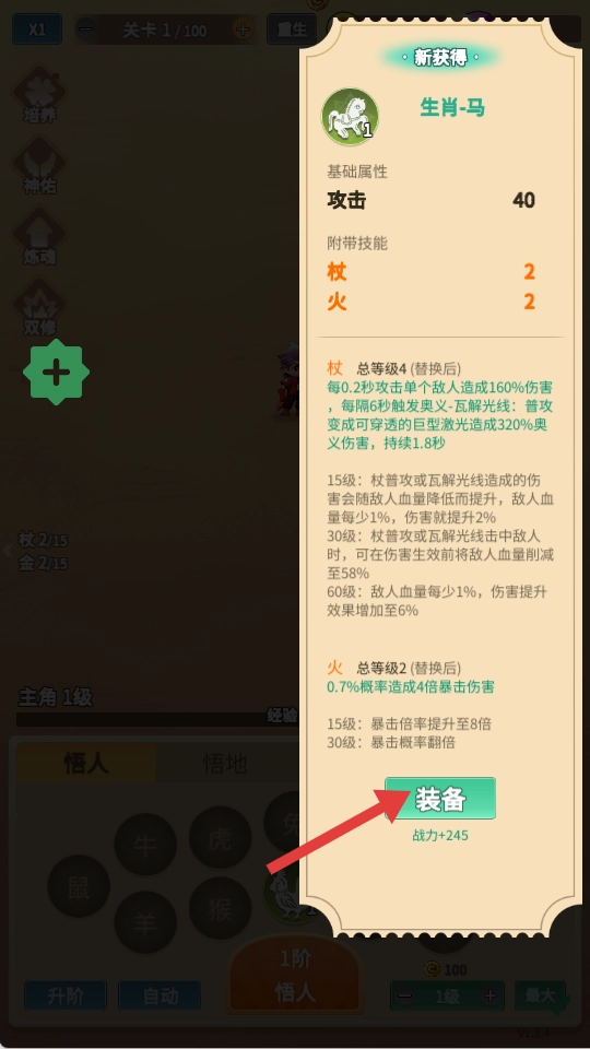 装备【生肖-马】,可提升攻击属性并激活附带技能,从而增强角色的战斗能力。